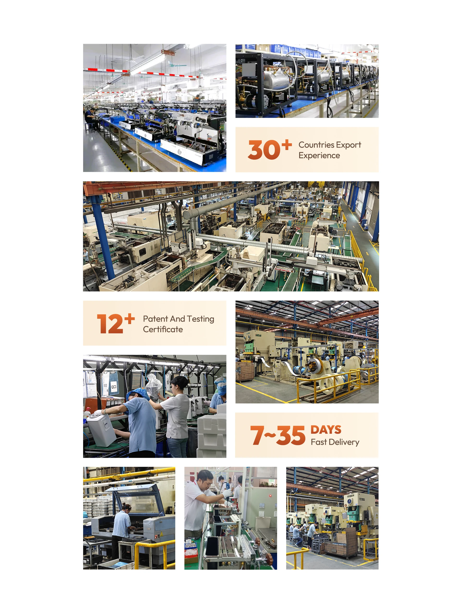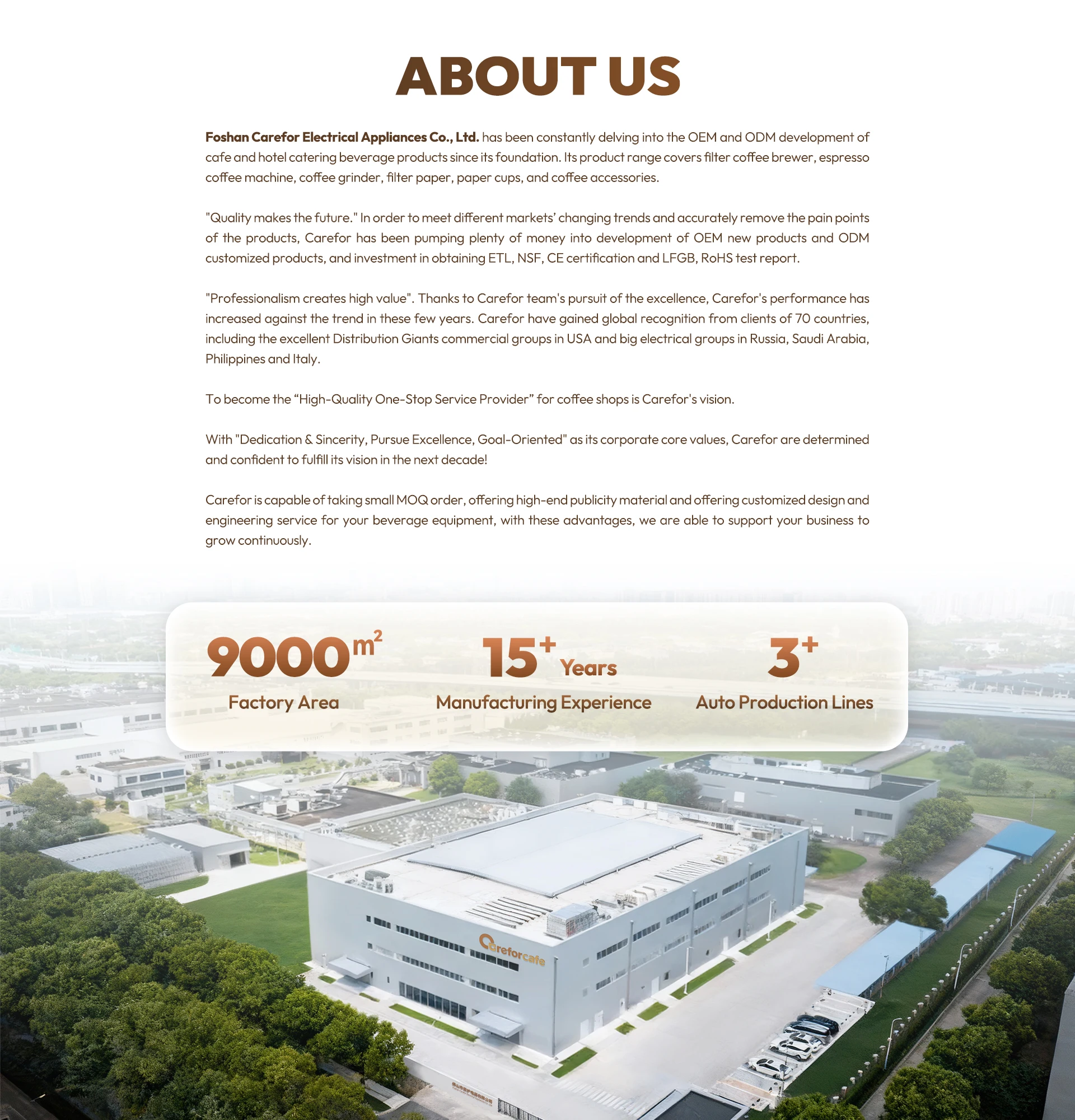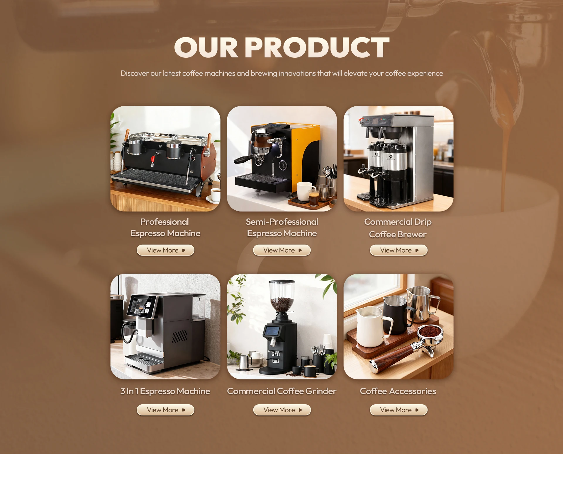 Основные продукты:Коммерческий эспрессо Mahine, Коммерческий пивовар кофе, Коммерческая кофемолка, Кофейные аксессуары, Урна с горячей водой